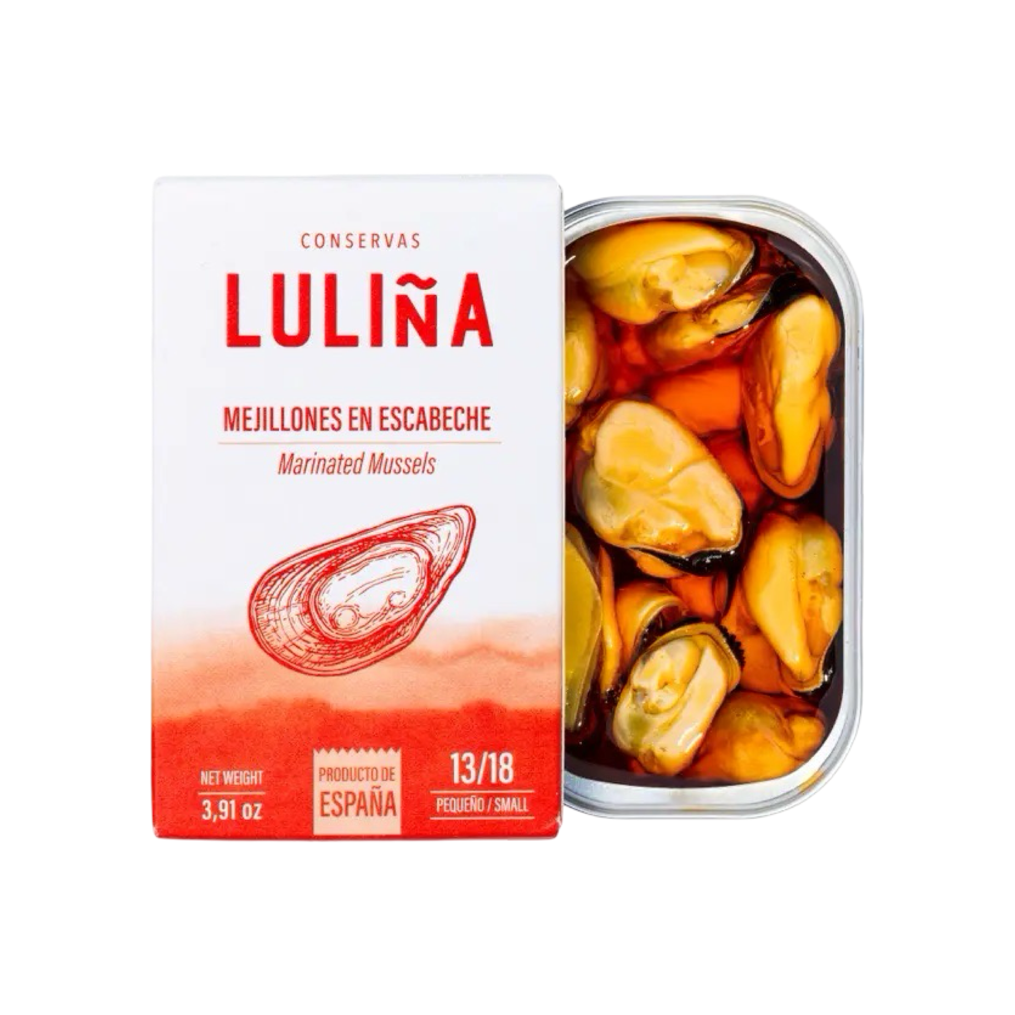 These small but mighty mussels (13–18 per tin) are sourced from the cool Atlantic waters of Galicia and preserved in a traditional escabeche marinade. Luliña’s recipe blends sunflower oil, white wine vinegar, sea salt, and warming spices for a tangy, balanced bite that’s ideal for snacking or pairing.