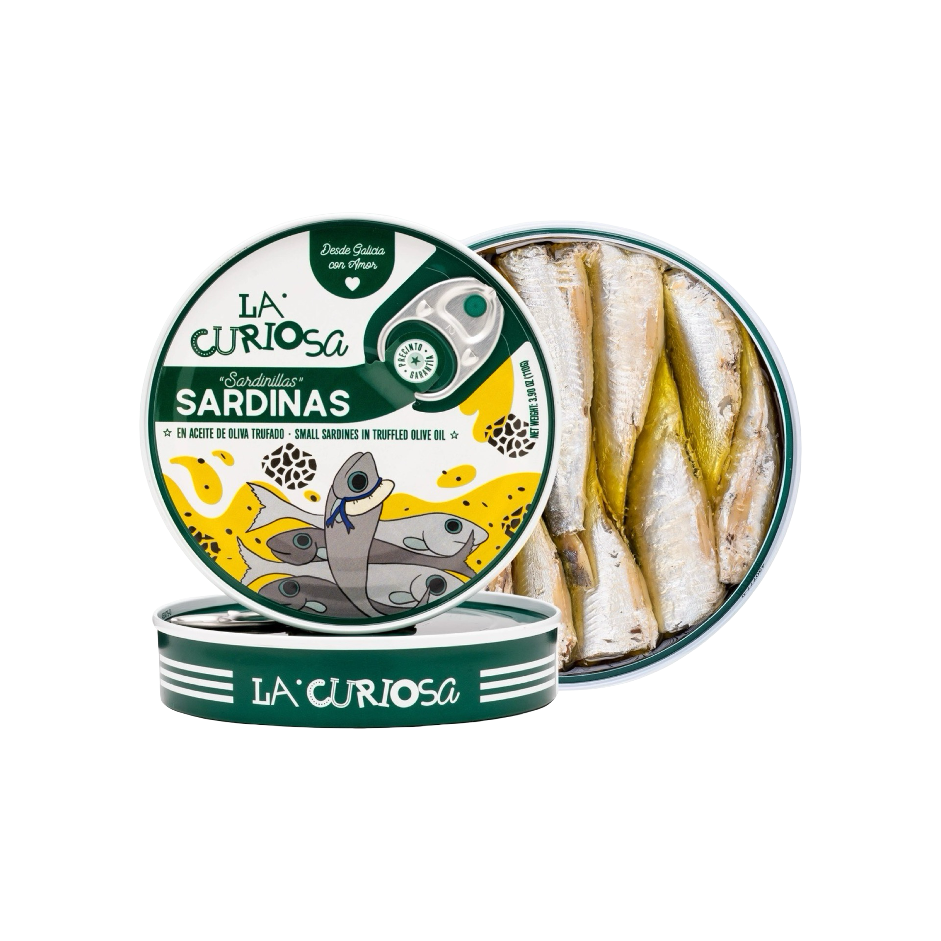 A tin that leans luxe. These small sardines (Sardina pilchardus) are selected for their delicate texture, hand-packed in premium Spanish olive oil, and infused with the deep, earthy aroma of natural truffle.