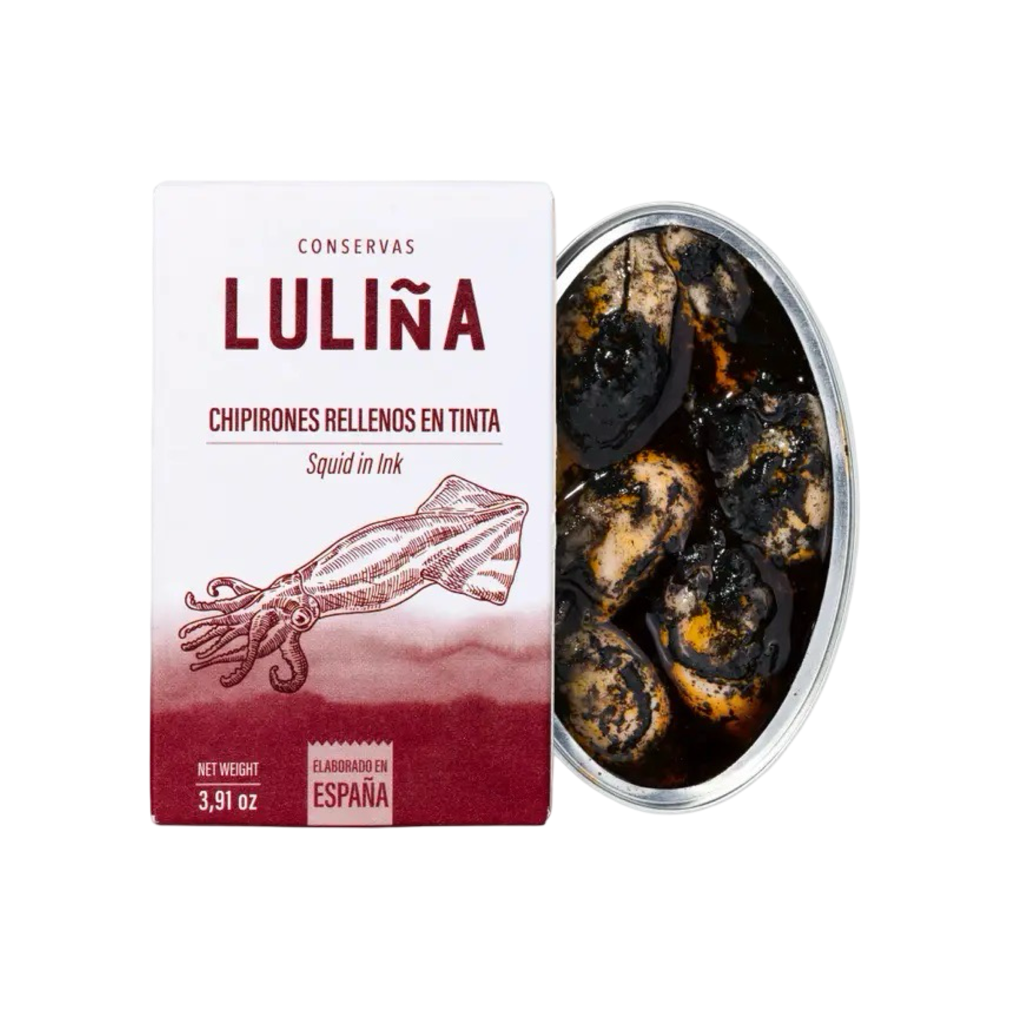 These delicate pieces of squid are sourced from the cold Atlantic waters of Galicia, where cephalopods develop exceptional texture and natural sweetness. Each squid is carefully cleaned by hand, then gently cooked to achieve perfect tenderness without becoming chewy. They are then arranged in the tin and covered in a rich, traditional ink sauce.